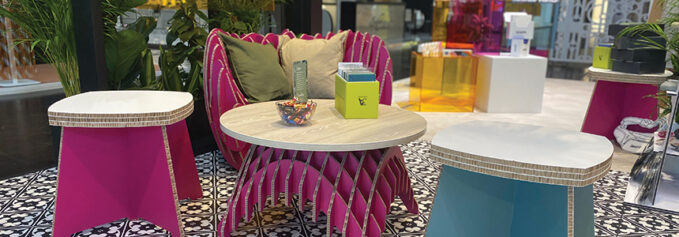 Above: 3A Composites’ SWEDBOARD FIBRE utilized for unique furniture displays in a trade show booth.